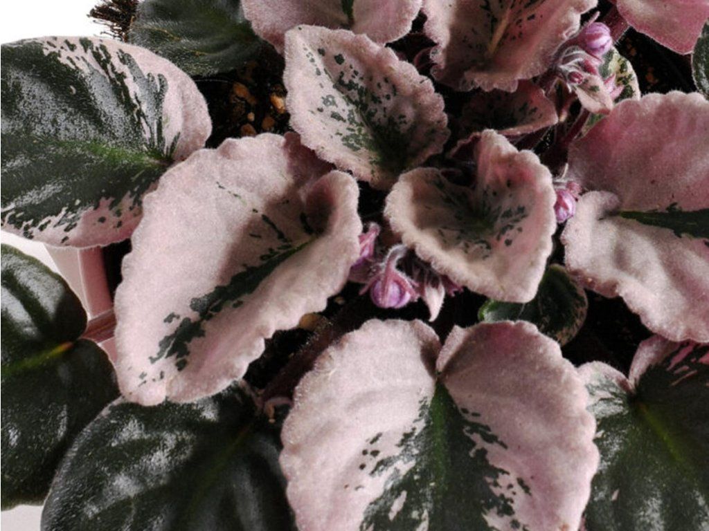 Afrikai ibolya variegata 'Hovariagata' - kedvelt szobanövény, könnyen gondozható. Gyönyörű apró rózsaszín virágokkal virágzik. A levelek húsosak és szőrösek, tapintásra puhák. A zöld mellett pasztell rózsaszín szín is átfut a levelein, ami egyedi megjelenést és bájt kölcsönöz a növénynek.