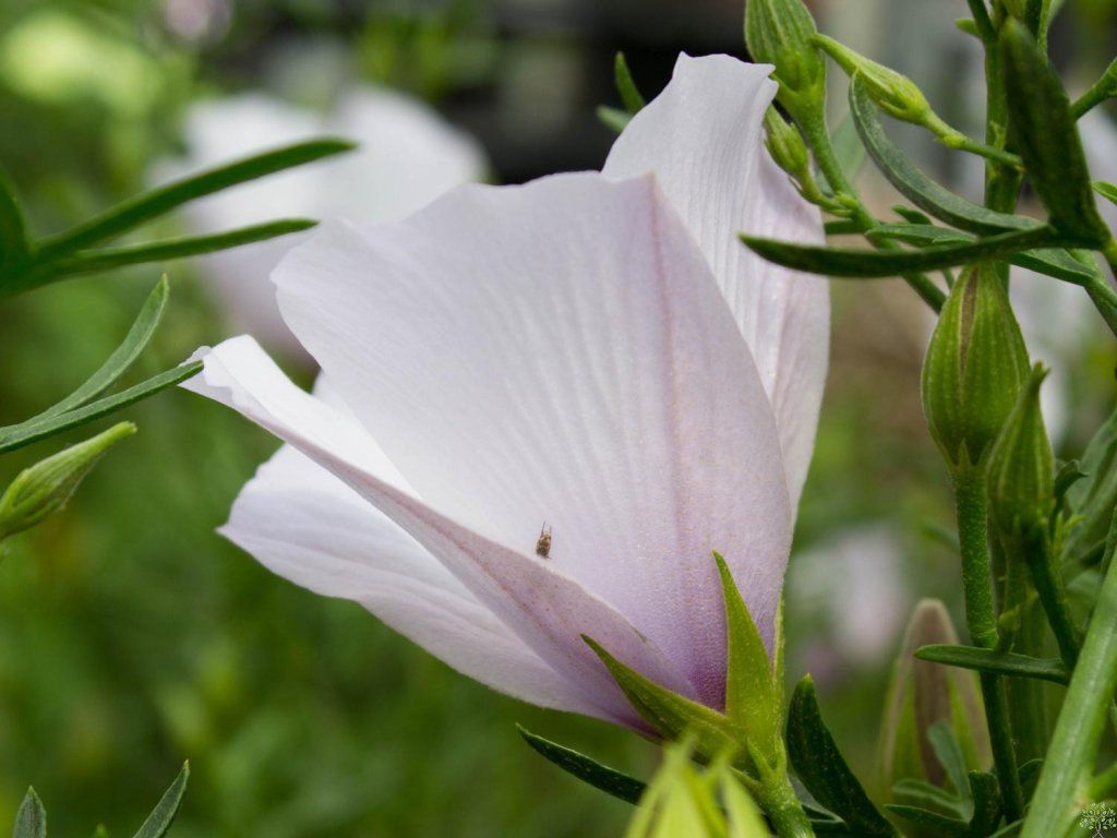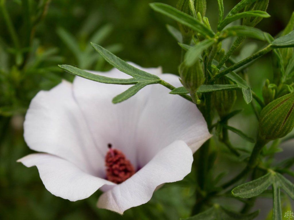Ausztrál hibiszkusz, Alyogyne 'Delightfully' - igénytelen cserje, 1-1,5 méter magasra nő. Sajátos körülmények között kizárólag hordozható növényként termesztik. A levelek aprók, keskenyek, három-öt karéjosak, sötétzöld színűek, enyhén szőrösek. A virágok kora tavasztól nyár végéig jelennek meg. Fehér színűek, nagyon gyakran lila árnyalattal. A virág egy hétig marad a cserjén, de azonnal újabbak virágoznak.