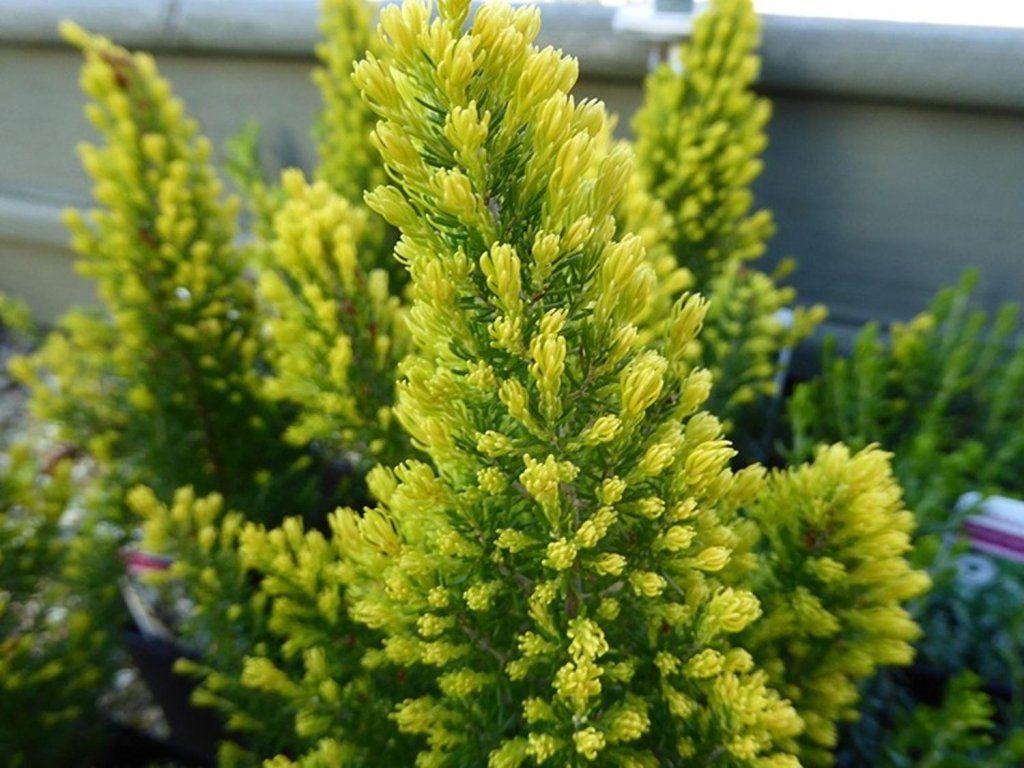 Hangos tőzegrozmaring 'Estrella Gold' - aktív, kompakt növekedésű tőzegrozmaring fajta, amelyet elsősorban élénk aranysárga, egész évben megmaradó lombozatáért értékelnek. Sűrű, finoman elágazó, örökzöld félcserjét alkot, szabályos, enyhén felálló habitussal, és általában 40-60 cm magasra nő, hasonló szélességgel. Kompakt méretének köszönhetően rendszeres metszés nélkül is rendezettnek tűnik. A levelek nagyon aprók, tűszerűek, sűrűn rendezettek az ágak mentén. A legintenzívebb színeződésük napos helyen érvényesül, ahol élénk aranysárga vagy sárgazöld árnyalatúak, félárnyékban inkább zöldes tónusok felé tolódhatnak. Tavasszal, általában márciustól májusig, a növény bőségesen virágzik apró, fehér virágokkal, sűrű fürtökben, amelyek vonzzák a méheket és más beporzókat. Elég fagytűrő, mégis ajánlott, különösen a fiatal növényeket védeni a fagyoktól. Használható hangafoltokban, sziklakerti részeken, edényekben, vagy mint színes kontraszt a sötét lombú vagy örökzöld fákhoz.