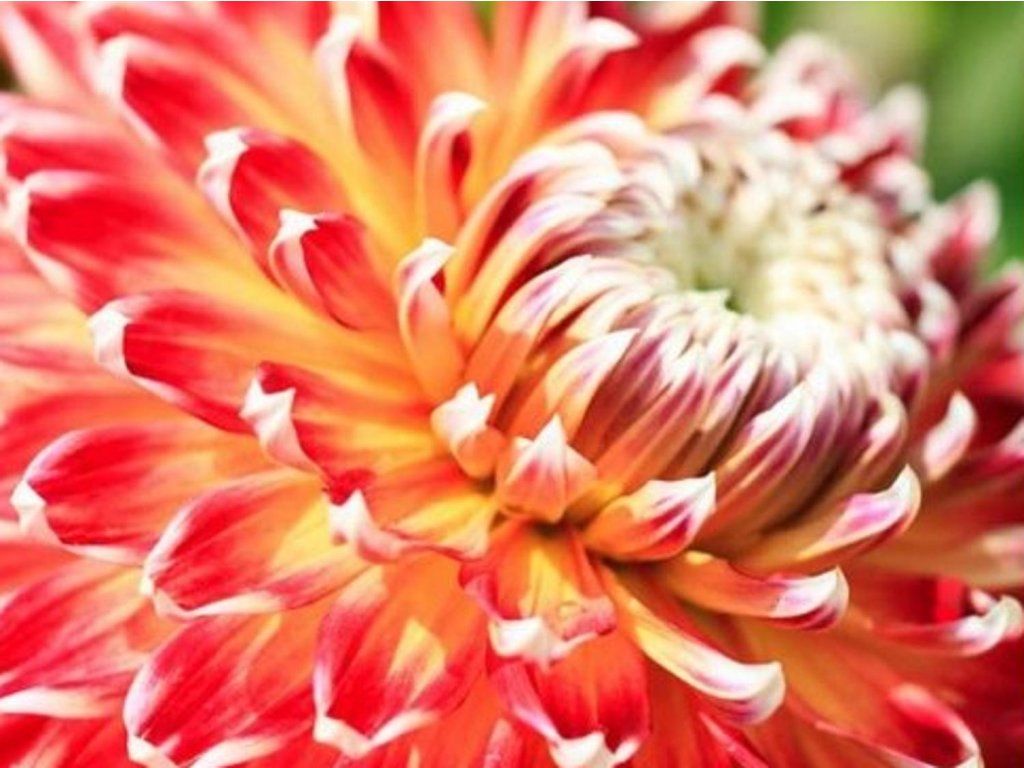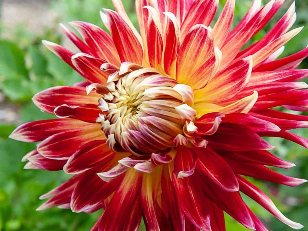 'Akita' dália - dús virágú fajta, amely jellegzetes, kb. 10–13 cm átmérőjű virágokat hoz, keskeny, enyhén csavarodott szirmokkal, amelyek mélyvörös, narancssárga és sárga színeket kombinálnak, finom fehér árnyalatokkal a végeken. Ez a gazdag színpaletta drámai és élénk megjelenést kölcsönöz a virágoknak, amelyek sötétzöld lombozat felett festett lángoknak tűnnek. A növény magassága körülbelül 90–120 cm, szélessége pedig körülbelül 40–60 cm, ami közepes magasságú fajtává teszi, ideális ágyások hátsó vagy középső részére, illetve egynyári és évelő növényekkel való csoportos ültetésre. A fajta júliustól októberig virágzik, és az intenzív színátmeneteknek köszönhetően gazdag vizuális elemet hoz a kertbe egész nyáron és ősszel. A nagy virágok vágott virágként is használhatók, ahol intenzív színeik hangsúlyossá teszik a kompozíciót.