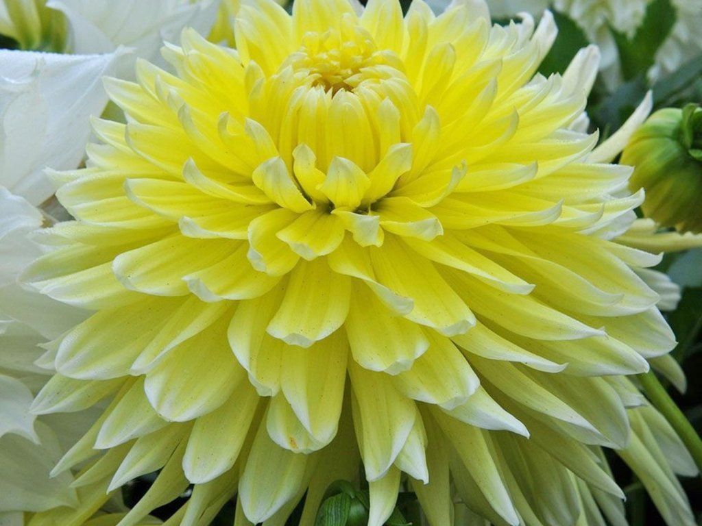 Dália 'Bilbao' - a dáliák a legnépszerűbb díszhagymák közé tartoznak. Ez a fajta nagy virágokat hoz létre, amelyeket élénk sárga szín jellemez. A virágok sűrű és szabályosan elrendezett, nyelv alakú szirmokból állnak, amelyeket fehér szegély díszít. A függőleges szárak végén nőnek, és júliustól októberig jelennek meg. Akár 100 cm magasra is megnő. Ültetése ideális bármilyen kerti kompozícióban, de leginkább más dália fajtákkal csoportosan ültetve érvényesül, és vázába vágott virágnak is alkalmas.