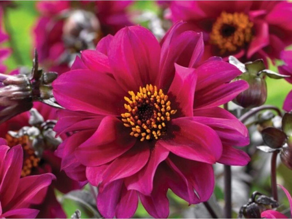 Dália 'Bishop of Canterbury' - a dália az egyik legkedveltebb gumós növény. Ez a kompakt formájú fajta közepes, rózsaszín-lila virágokat hoz létre, amelyek kiválóan kontrasztálnak a sötétzöld levelekkel. A virágok bőségesen nőnek az egyenes szárak végén, és júniustól októberig jelennek meg. 60-70 cm magasra nő. Ültetése bármilyen kerti kompozícióban ideális, de leginkább más dália fajtákkal együtt, csoportosan mutat jól, és edényben való termesztésre is alkalmas.