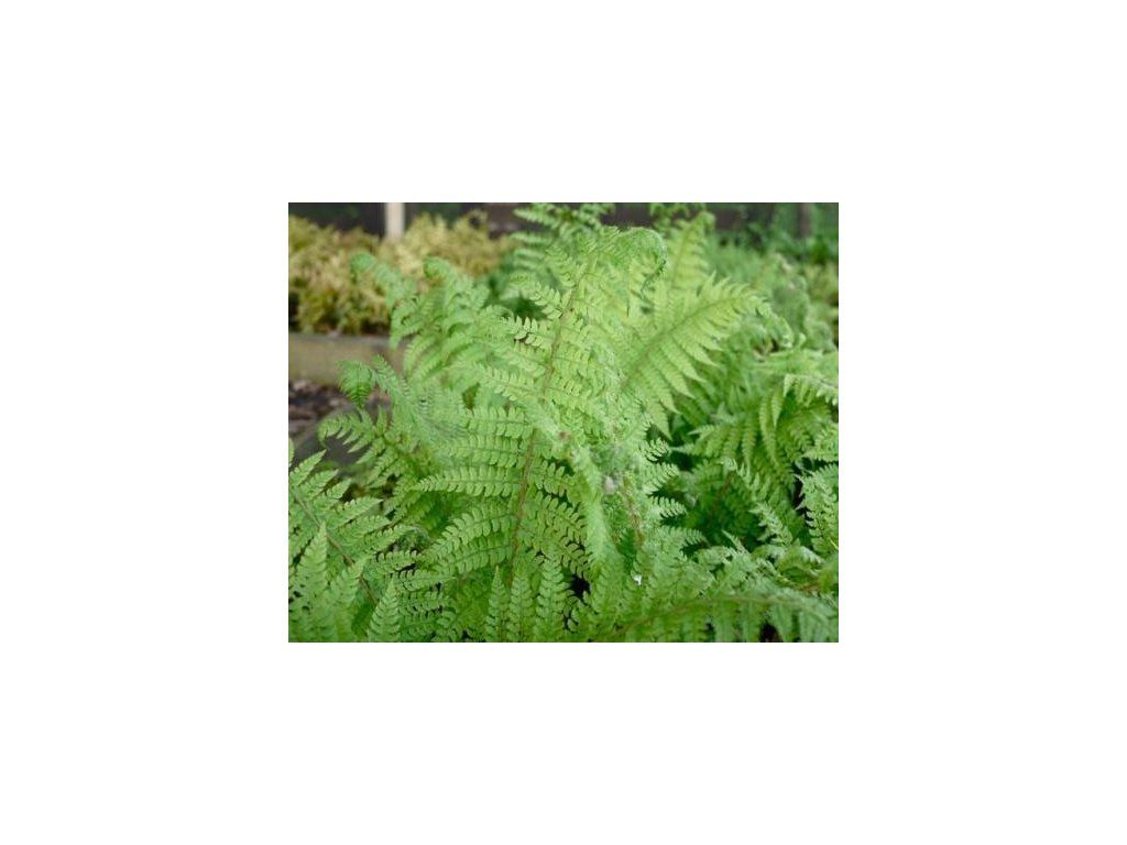 Hajmócipős páfrány 'Dahlem' - felálló páfrány, finoman osztott levelekkel. Akár 90 cm magasra nő. A levelek színe világosabb zöld, helyenként ezüstös árnyalattal. Enyhébb teleken nem hullatja le a leveleit.