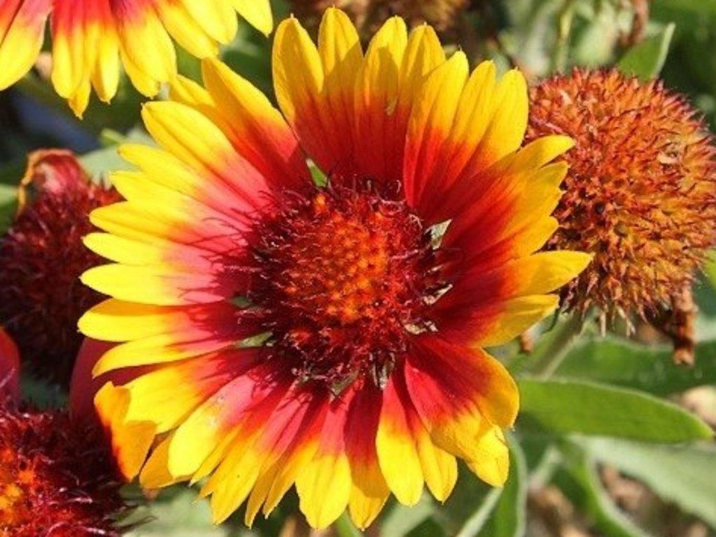 Gaillardia aristata 'Arizona Sun' - Észak-Amerika préri területeiről származik, ahol száraz, napos, könnyebb talajú élőhelyeken nő. A fajta a korai virágzású, kompakt gaillardia fajták közé tartozik, és hosszú virágzási idejével nemzetközi vizsgálatokon is elismerést nyert. Sűrű, alacsony bokrot képez, amely virágzáskor körülbelül 0,2–0,4 m magas és 0,4–0,5 m széles. A levelek keskenyen lándzsásak, durván szőrösek, zöldtől a szürkészöldig terjednek, érintésre enyhén durvának tűnnek, és forróságban is jól tartják formájukat. Júniustól szeptemberig a levelek fölé erős szárakon körülbelül 6–8 cm-es virágfejek nőnek, a nyelv alakú virágok élénk sárgák, a közepe körül egyértelmű piros gyűrűvel, és a fokozatos virágzás során a színkontraszt úgy változik, mint egy parázsló szényszél. A virágok gazdag nektár- és pollenforrást jelentenek a méhek és a pillangók számára, és vázában nyári vágott virágként is megállják a helyüket. Kompozícióban jól harmonizál díszfüvekkel, zsályákkal, macskamentával, cickafarkkal vagy varjúhársakkal, ahol a meleg színek apró tűzfészkekként hatnak az ágyás elején. A magasabb, 0,6–0,8 m-re növő gaillardia fajtákhoz képest kevesebb helyet foglal el, és jobban tartható a szegély tiszta vonalában.