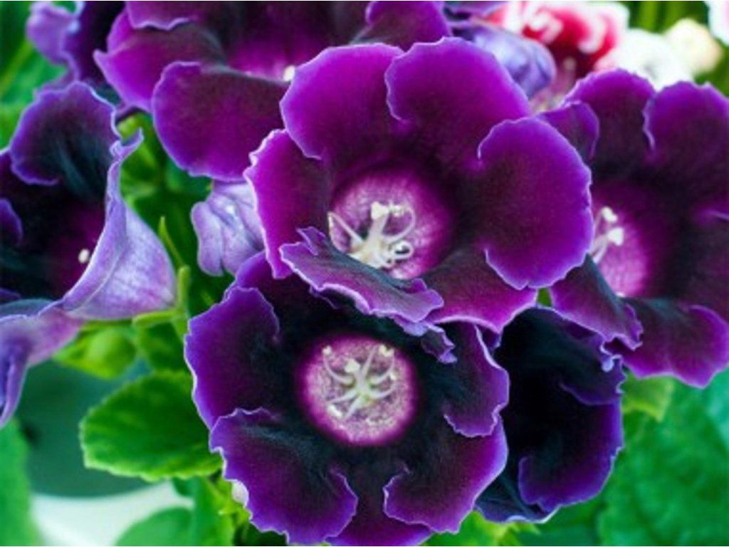 Gloxinia 'Violacea' - növény harang alakú, nagyon feltűnő virágokkal, amelyek bársonyos hatást keltenek. Sok bimbója van, tehát nagyon bőségesen virágzik. A virág alap színe fukszia lila. A sziromlevelek szélei enyhén világosabbak és hullámosak. A növény magassága körülbelül 25-30 cm. Áprilistól októberig virágzik. A levelek nagyok, szőrösek, első pillantásra húsosak, sötétzöld színűek, jellegzetes rajzolattal. Szobanövény.