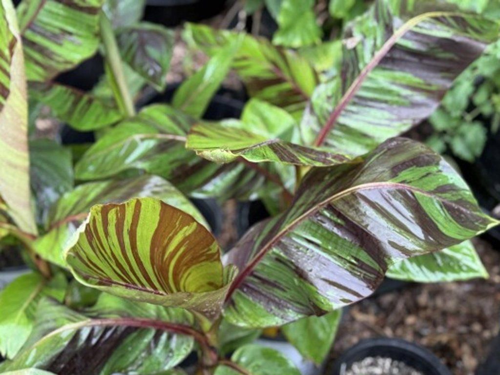 Himalájai banánfa 'Red Tiger' - egzotikus növény egyedi megjelenéssel. A Himalája előteréből származik Szikkim és Északkelet-India területéről, ahol a monszunerdők szélén és tisztásain nő, akár 2000 méter tengerszint feletti magasságig. A 'Red Tiger' fajtát nagy, sötétvörös vagy mélybordó erezettségű és foltos levelei miatt termesztik, amelyek az életkor előrehaladtával, különösen teljes napfényben, egyre hangsúlyosabbá válnak. A növény nem képez valódi törzset, hanem a levélhüvelyekből egy erős pszeudotörzset, gyakran enyhe pirosas árnyalattal. Több hajtásból álló csomót képez, a levelek 1,5–2 m hosszúak lehetnek, és szezonban trópusi hátteret biztosítanak díszfüvek, kúpvirágok, varjúháj vagy sötét levelű tündérfüzekék számára. A virágzat inkább 2–3 évszak után jelenik meg egy érett hajtáson, sárga vagy krémszínű, és virágzás után apró terméseket hozhat, amelyek Csehországban általában nem érnek be. A Musa basjoo-hoz képest a levéllemez erősebb, és gyakran kevésbé tépi szét a szél, így a fajta kötözés nélkül is rendezettebbnek tűnik.
