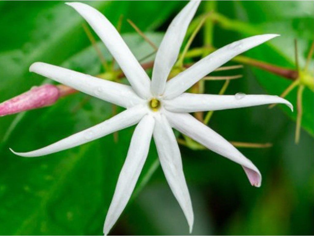 'Angel Wings' jázmin - Örökzöld fajta az Oleaceae nemzetségből, eredetileg Himalájából és Délkelet-Ázsiából, ahol a jázminokat meleg erdőszéleken és lejtőkön használják. Nálunk futónövényként vagy lazábban épített cserjéként növekszik, a vezetés módjától függően. A hajtások általában 3–5 m magasak, a növekedés szélessége 1–1,2 m körül van. A levelek bőrneműek, keskenyen tojásdadok vagy lándzsásak, erősen fényesek és sötétzöldek, így a növény a virágzáson kívül is dekoratív. Júniustól szeptemberig jelennek meg csillag alakú virágok keskeny karokkal, tiszta fehér színben, a bimbók és a csészék vöröses vagy lilás árnyalatot hordozhatnak. A meleg napokon gyakran finom illat érezhető. A fajta alkalmas pergolákhoz, napos falakhoz és télikertekhez, nagy edényekben is jól mutat, ahol a levelek csillogásának és a fehér virágoknak a kontrasztját a sötét aljzat vagy kavics kiemeli. A virágoknak édes illatuk van, és egész nyáron át a növényen maradnak.