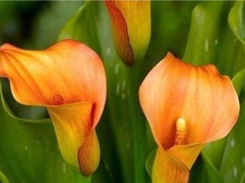 Kala 'Mozart' - ennek a kallának csöves virágai az érett, lédús őszibarack színét öltik. A pasztell narancssárgát a piros vagy rózsaszín árnyalata kíséri. A nagyobb kontrasztot a sötétzöld, foltos levelek adják. 30-60 cm magasra nő, ugyanolyan széles. Júliustól virágzik az ágyásban. Vágásra alkalmas.