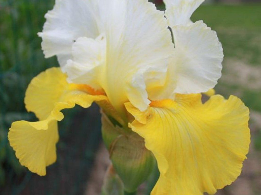 Német írisz 'Echo de France' - 85 cm magasra növő, hosszú virágzási idejű írisz. Felső szirmai hófehérek, lefelé haladva élénk sárgára színeződnek. Május végétől virágzik, majd nyár végén másodvirágzásban. Kellemes illatú is. A szár ellenáll a szélnek és elegendő szilárdsággal rendelkezik. Kard alakú, lapos levelek csoportjait alkotja, amelyek szürkészöldek, kékeszöld árnyalattal.
