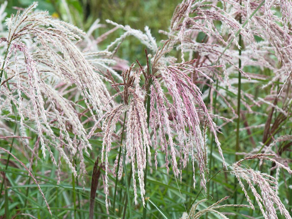 Kaskáde kínai díszfű – felfelé törő díszfű, amely 180 cm magasra és 120 cm szélesre nő. A nyári hónapokban jelennek meg a virágok, amelyek világos rózsaszínűek, ezüstös árnyalattal. Csüngő. Az őszi hónapokban a levelek bronzos-pirosra színeződnek. Kiválóan mutat szólóban vagy évelőágyás részeként. Nagyon jól mutat alacsonyabb díszfüvek társaságában is.