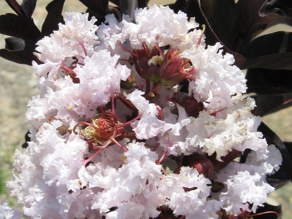 Lagerstroemia 'Blush' - a Black Diamond sorozat egyik fajtája. 3 méter magasra és 2,5 méter szélesre nő. A cserje dúsan leveles, a levelek sötétvörös vagy lilás-feketék, és nem hajlamosak a szezon során kifakulni. Ősszel inkább narancsvörösek. Júniustól szeptemberig világos rózsaszín, enyhén hullámos virágokra számíthatunk, amelyek gyönyörűen kiegészítik a levelek intenzív színét.
