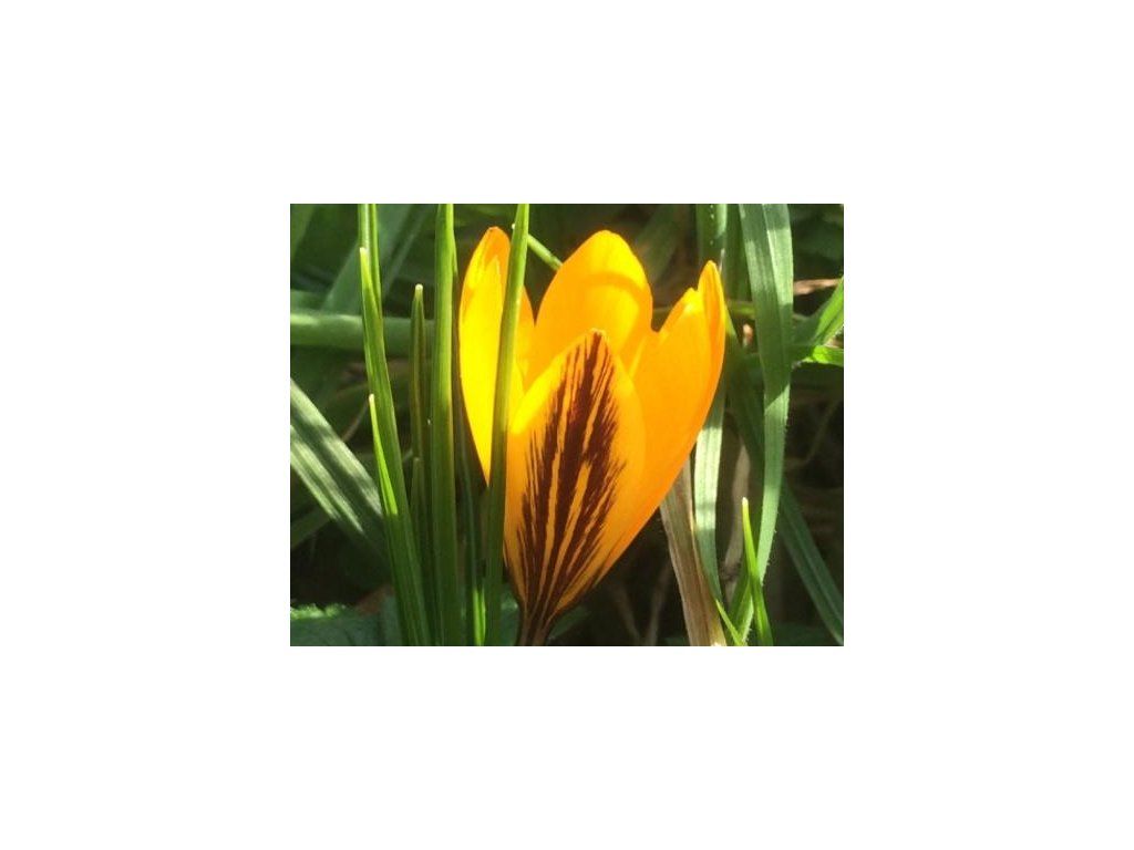 Krokus x stellaris - arany-sárga krókusz, 10 cm magasra nő, jellegzetes, barna-ibolya csíkozattal. Februártól márciusig virágzik.