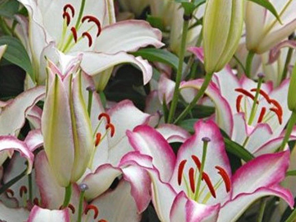 'Hotline' liliom - kelet-ázsiai hibrid liliom. Ez a liliom hatalmas, pezsgő fehér, felfelé növő virágokkal rendelkezik, mély, ragyogó rózsaszín-piros színnel végződve. A virágok nagyon illatosak. Körülbelül 100 cm magasra nőnek, és augusztusban jelennek meg. Nagyon érdekesen színezett liliom, amelyet nem fogsz gyakran látni a kertekben.