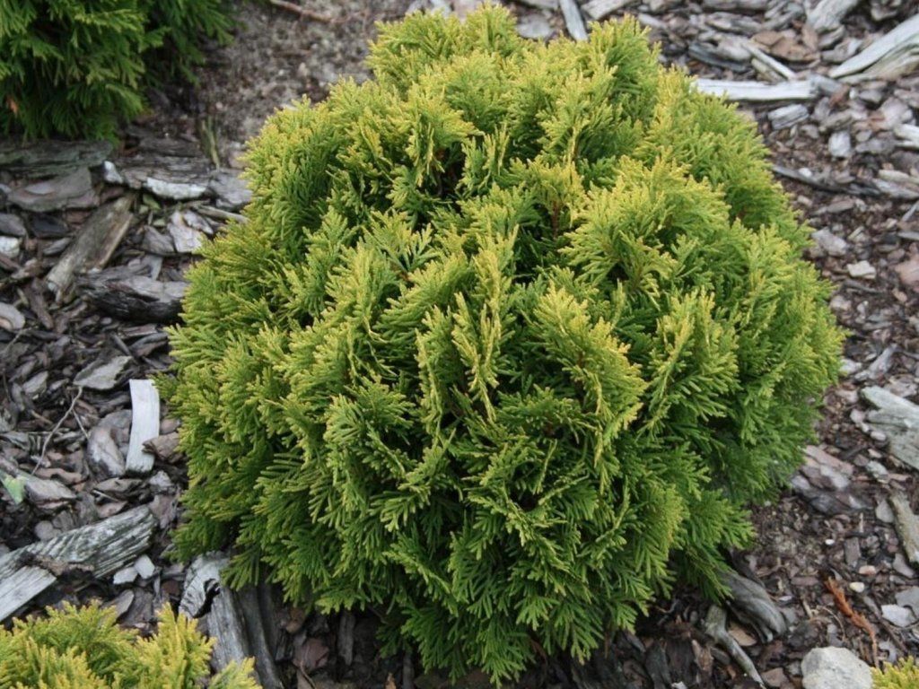 Nyugati tuja 'Mirjam' - egy feltűnő törpe fajta, természetesen gömbölyded habitussal és nagyon lassú, egyenletes növekedéssel, amely hosszú távon, metszés nélkül is megőrzi kompakt formáját. A tűlevelek finomak, sűrűn elhelyezkedők, és a vegetációs időszakban élénk aranysárga színűek, amely ősszel és télen meleg narancssárga vagy réz tónusokra változik, így a növény markáns szezonális változékonyságot mutat. Körülbelül tíz évvel az ültetés után eléri a 50 cm magasságot, kifejlett korában magassága és szélessége általában 80 és 90 cm között mozog. A fajtát jó fagyállóság jellemzi, akár -30 °C-ig, és stabil növekedést mutat Csehországban. Kisméretének és dekoratív színének köszönhetően különösen alkalmas kisebb kertekbe, előkertekbe és sziklakertbe, nagyon jól használható tartályokban történő hosszú távú termesztéshez is, ahol színes szoliterként vagy sötétlevelű fák vagy évelők kompozícióinak részeként is funkcionál.