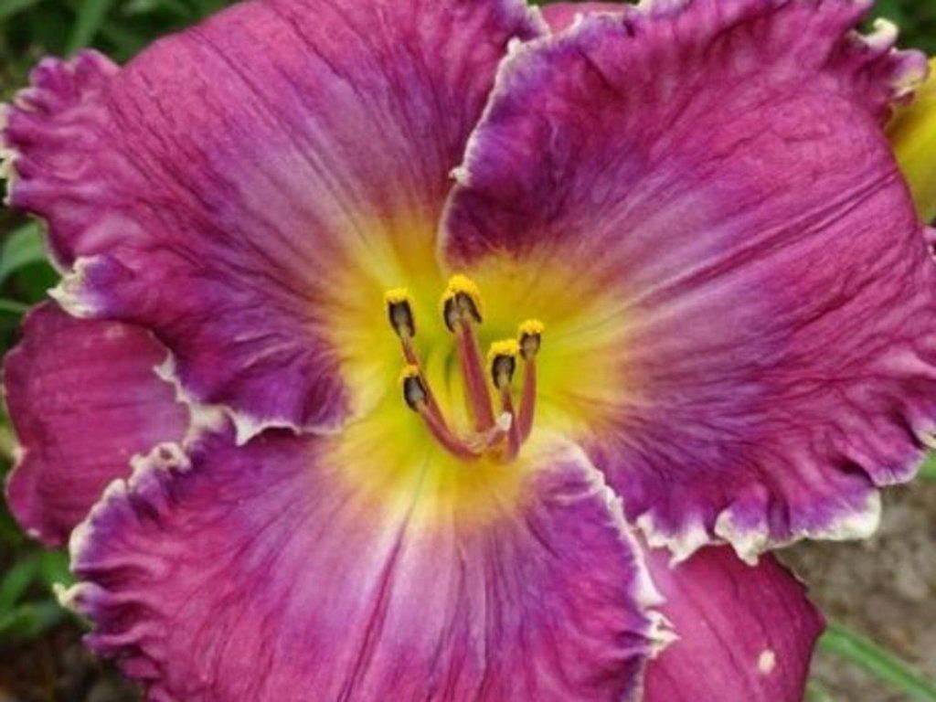 Hemerocallis 'Face of the Stars' - bíboribolya virágai akár 15 cm szélesek ennél a kultivarnál. A hullámos szegélyeket vajsárga árnyalat szegélyezi. A középső torok sárgászöld. 60 cm magasra nő, és nyáron virágzik.