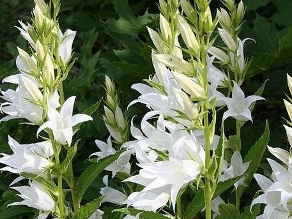 Széleslevelű harangvirág - magas harangvirág fajta, amely bár "fehér virágúnak" neveztetik, világoskék, nagyobb virágok fürtjeivel virágzik. Nem túl ismert, és ritkán látni a kertjeinkben, annak ellenére, hogy egy igénytelen évelő növény, amely akár 1 m magasra is megnő. A virágzás júniustól szeptemberig tart. Ez a harangvirág nagy termete miatt csoportos ültetésben használható nagyobb kertekben vagy parkokban, vagy szoliterként kisebb kertekben.
