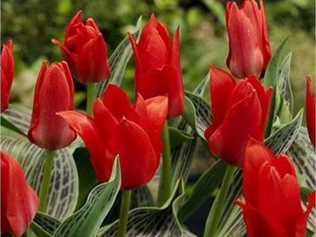 'Alibaba' tulipán - alacsony tulipán, mindössze 20 cm magas. Piros-narancssárga színben virágzik, levelei mattzöldek, barna foltokkal. A tavaszi szezon elején jelenik meg.