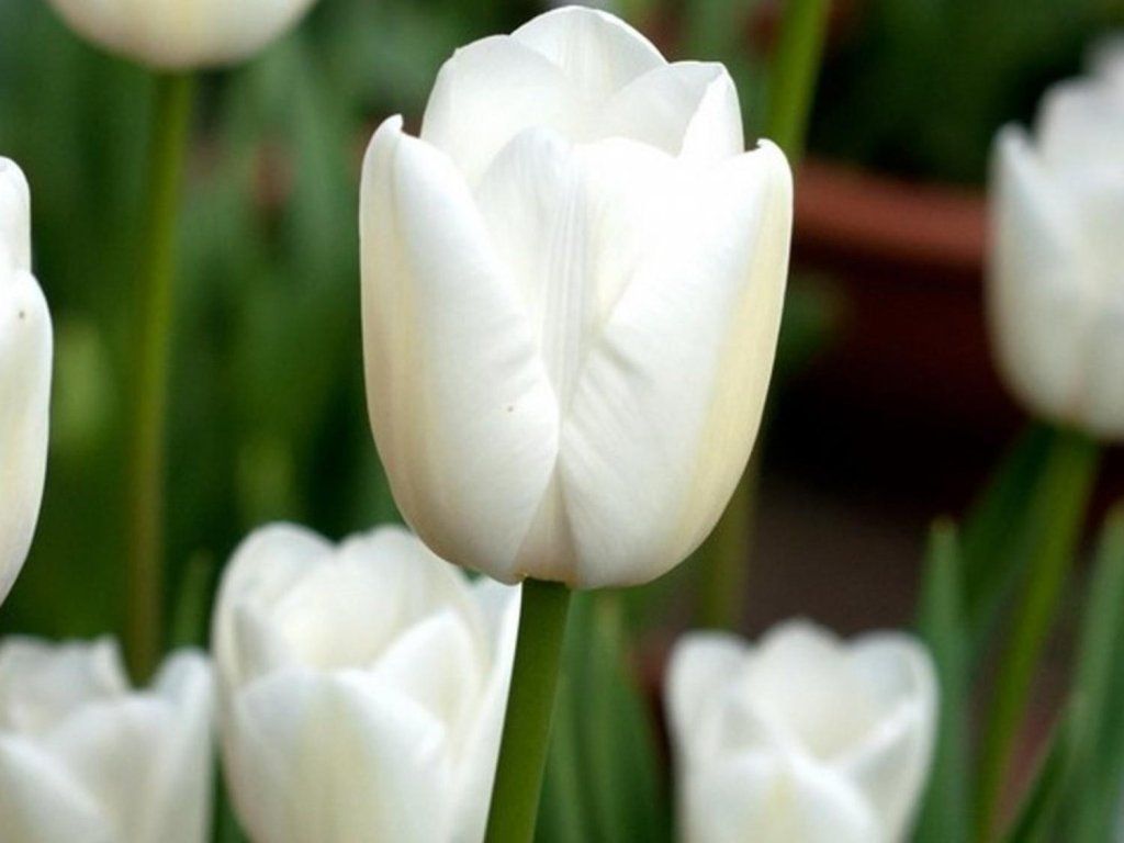 'White Marvel' tulipán - erős szárú tulipán, szirmai elefántcsontfehértől a ragyogó fehérig nyílnak. Április közepétől virágzik, magassága 35-45 cm. A zöld szárak és levelek gyönyörűen harmonizálnak a virágokkal. A virágágyásban önmagukban vagy lila tulipánokkal kombinálva érvényesülnek.